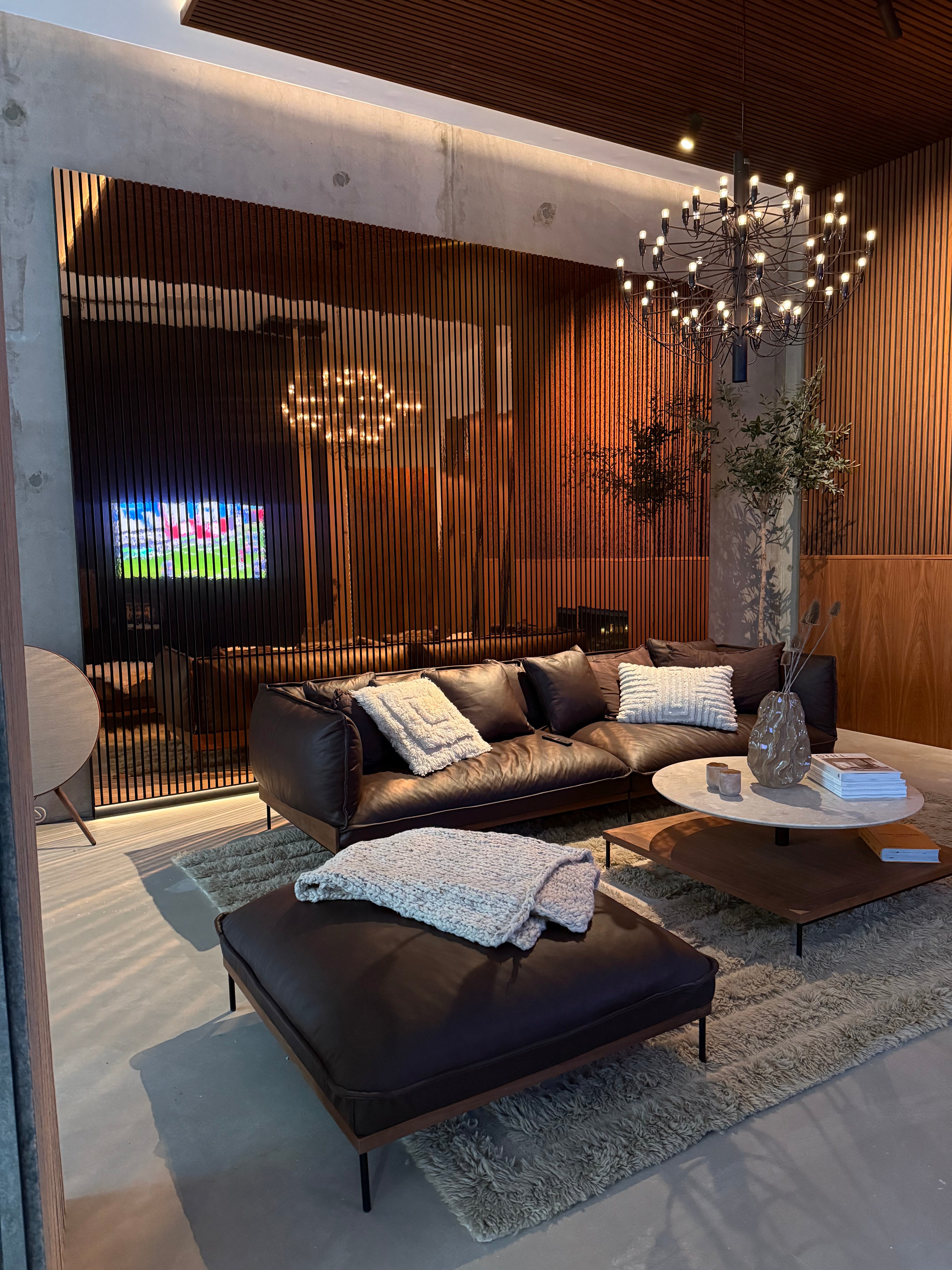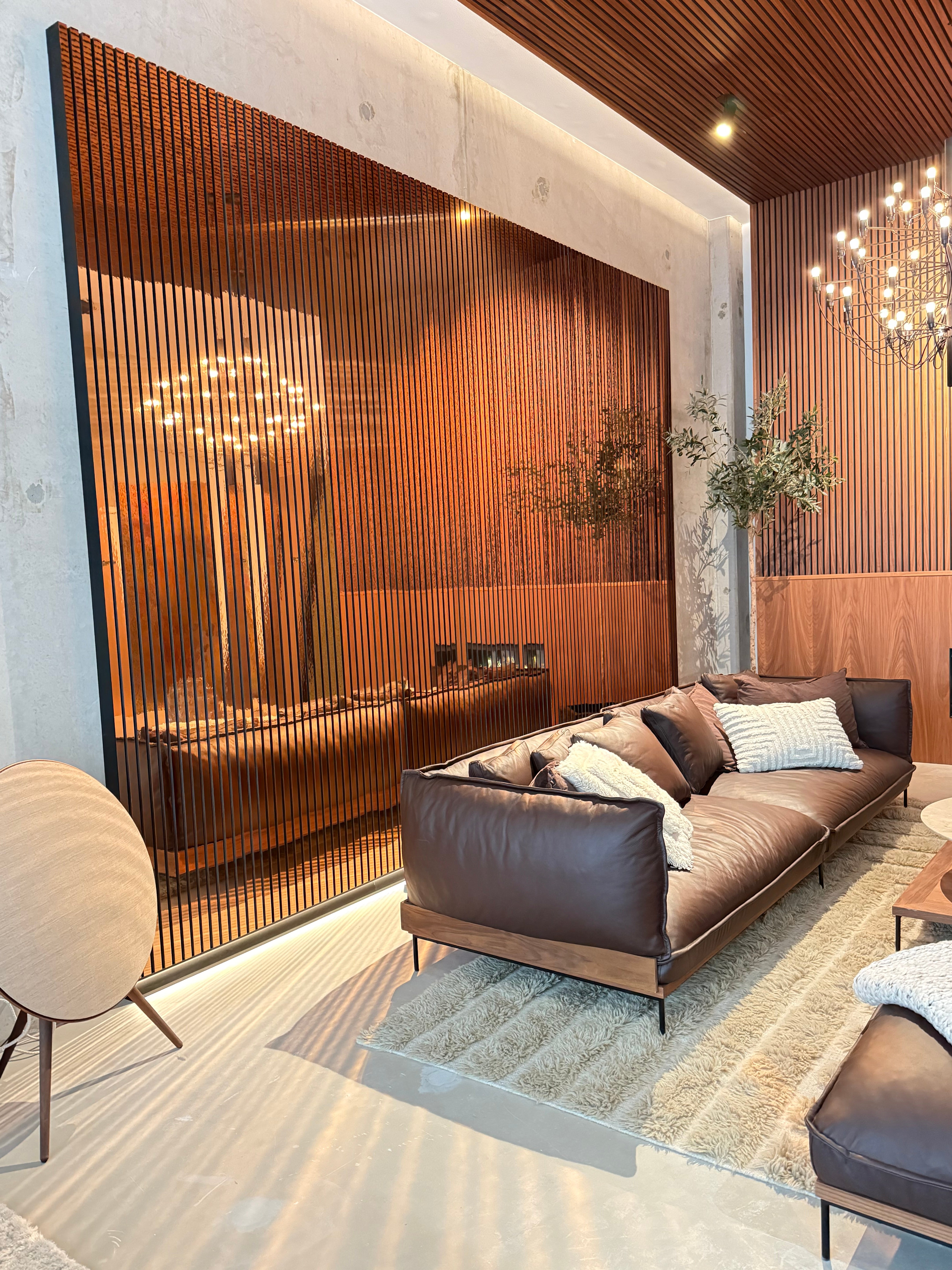 Die Oberflächenstruktur und -verarbeitung fangen das Licht auf lebendige Weise ein und reflektieren es, wodurch die Wände Dynamik, Kontrast und eine ausgeprägte räumliche Präsenz erhalten. Das Ergebnis ist ein Interieur mit visueller Wirkung und einem raffinierten Lichtspiel, in dem die Paneele als architektonisches Gestaltungselement und nicht nur als akustische Lösung fungieren.