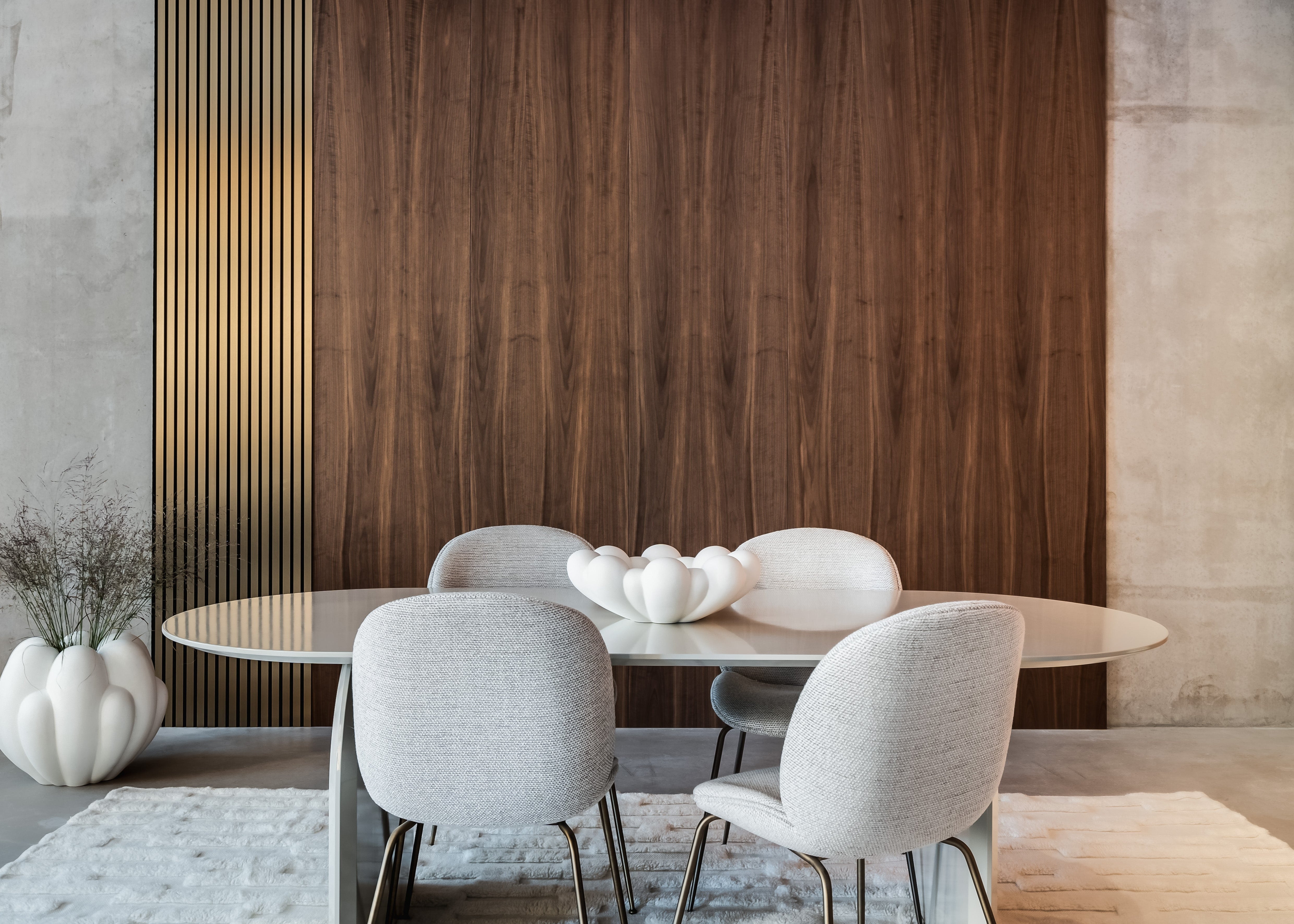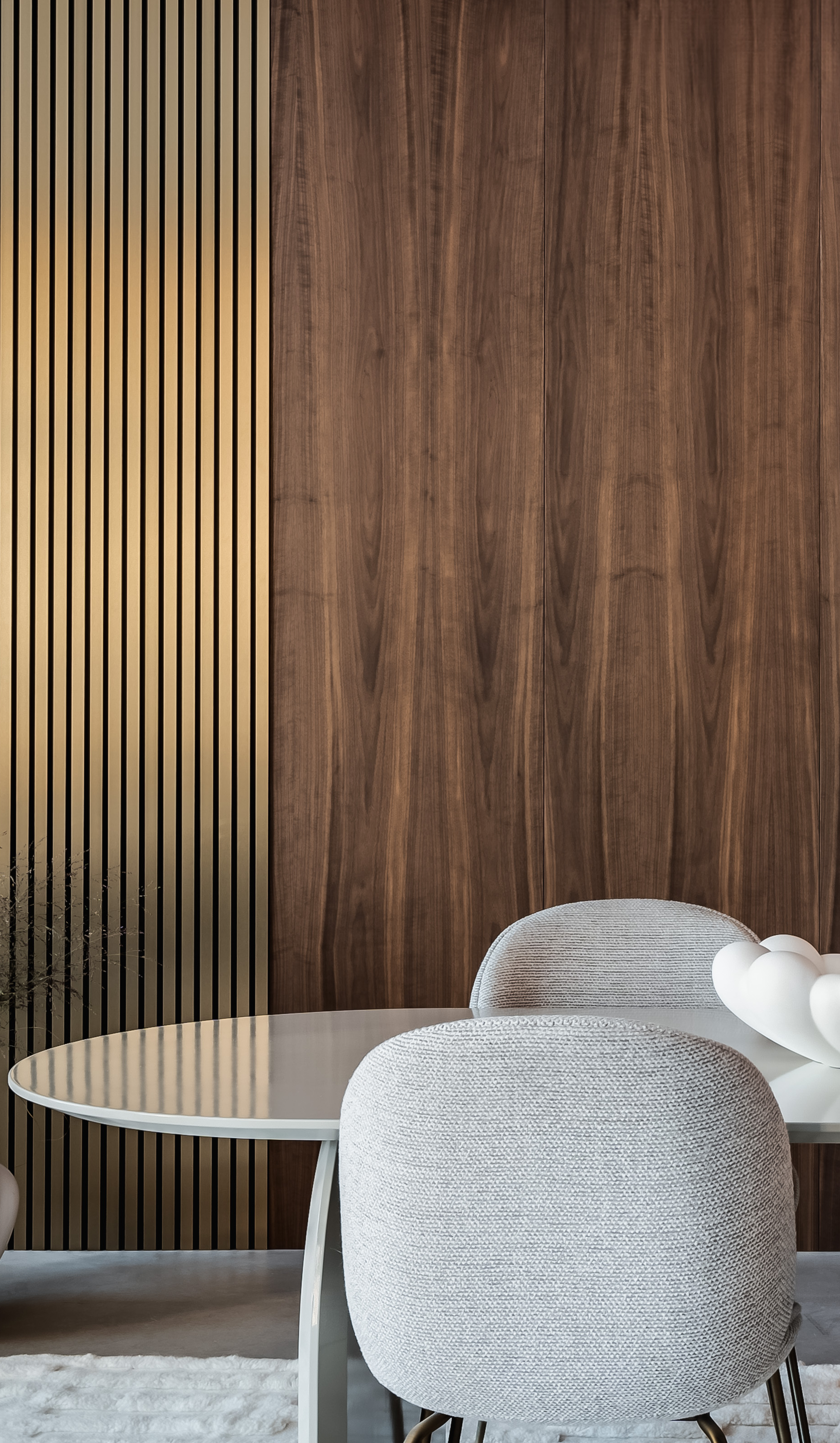 Ytans struktur och finish fångar och reflekterar ljuset på ett levande sätt, vilket ger väggarna rörelse, kontrast och en tydlig rumslig närvaro. Resultatet blir en interiör med både visuell tyngd och ett sofistikerat ljusspel, där panelerna fungerar som ett arkitektoniskt designelement snarare än enbart en akustisk lösning.