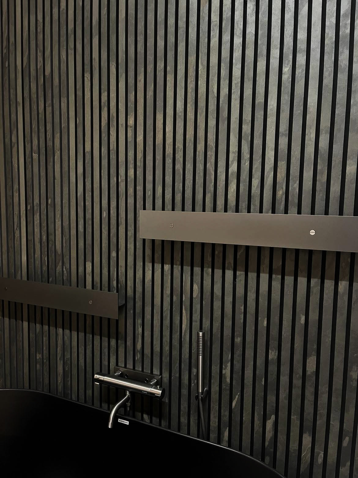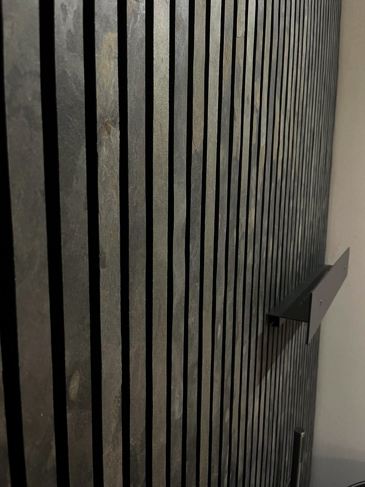 Akustikpaneler i sten kombinerar naturlig stenyta med effektiv ljudabsorption och skapar rum med både visuell tyngd och behaglig akustik. Den massiva, oregelbundna stenstrukturen bidrar till att sprida ljudvågor i rummet, samtidigt som akustikfilten absorberar efterklang och förbättrar ljudmiljön.
